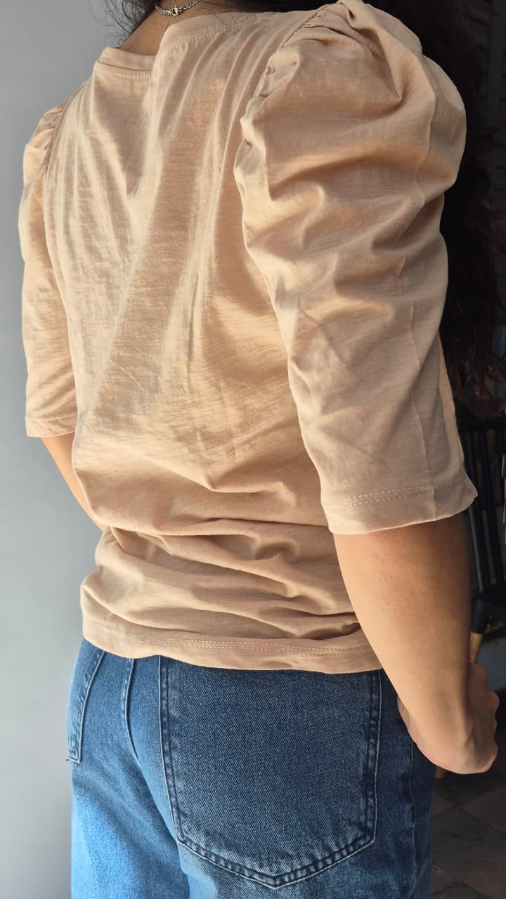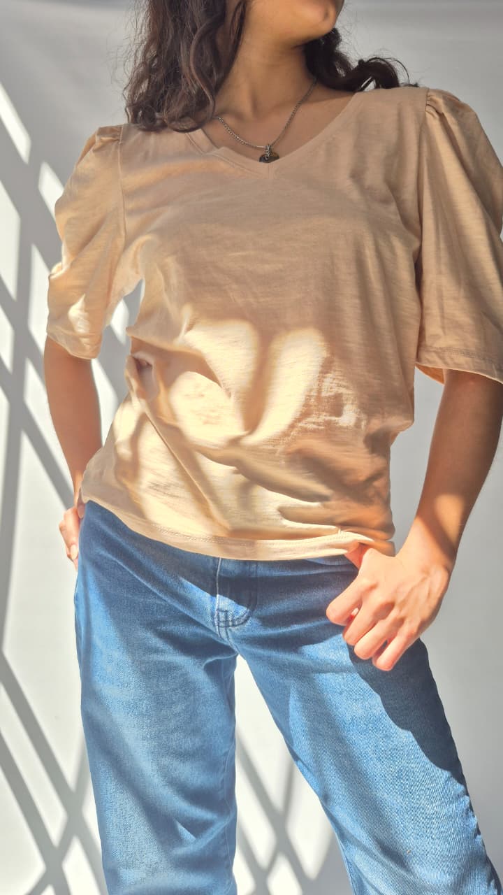 Remera de calce recto con escote en v y manga con frunce