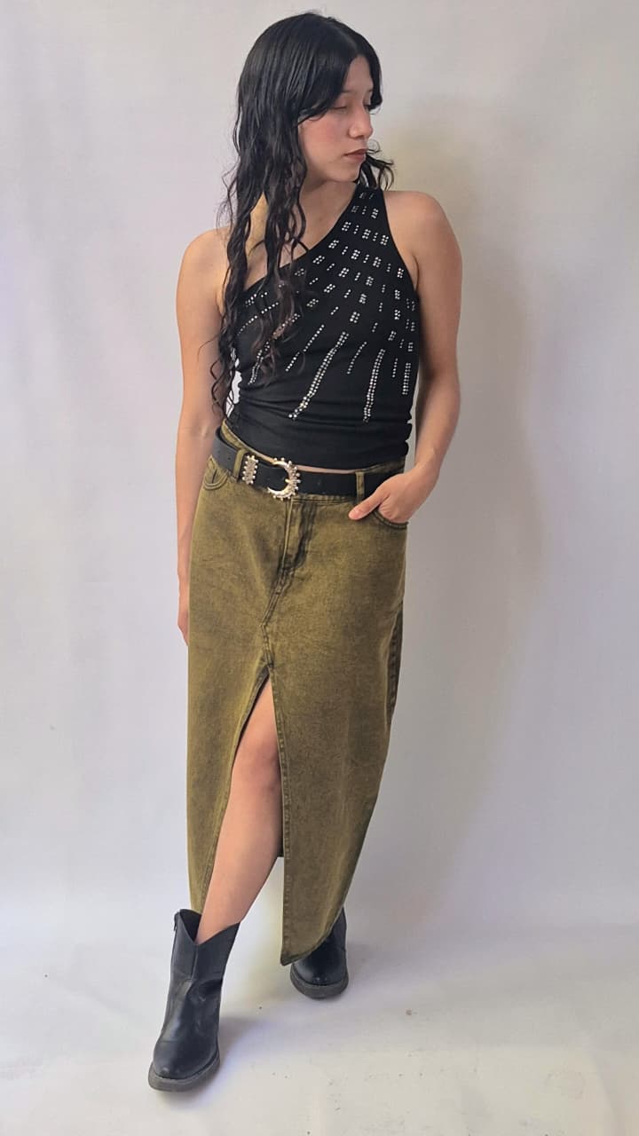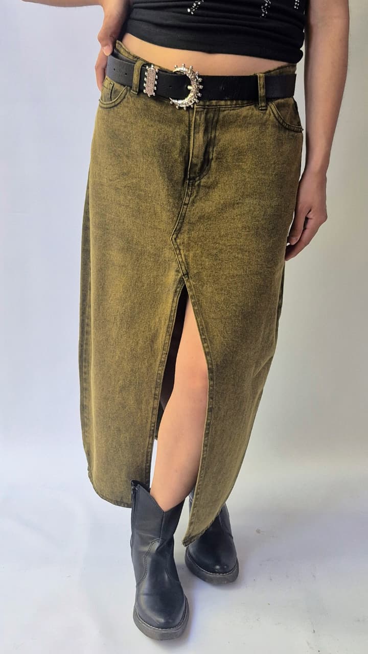 Falda de denim de silueta evasè, se ajusta en la cintura y se va ampliando hacia el ruedo. Largo hasta los tobillos, bolsillos delanteros, traseros y abertura frontal