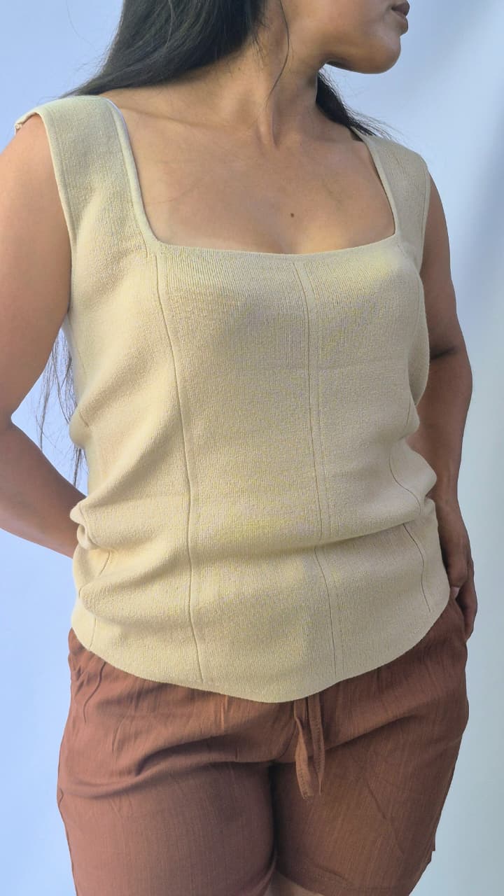 Top de punto con escote cuadrado y lineas de costuras verticales que sugieren un estilo tipo corsé.