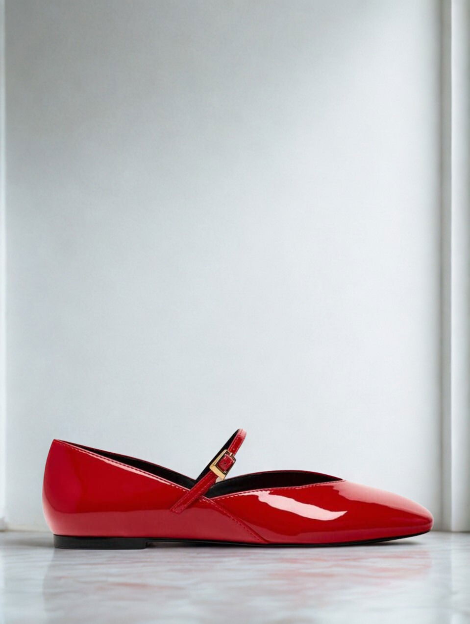 Zapato tipo bailarina con detalle de tira con aplique metálico. Acabado en punta redonda.