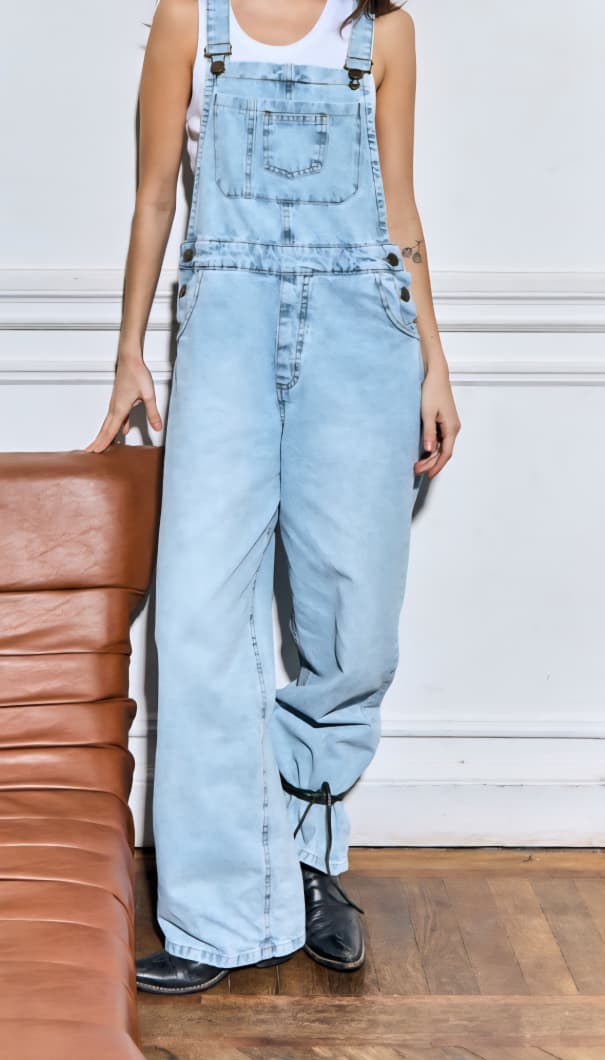 Se caracteriza por su corte holgado desde la cadera hasta el tobillo y su tono celeste claro.