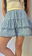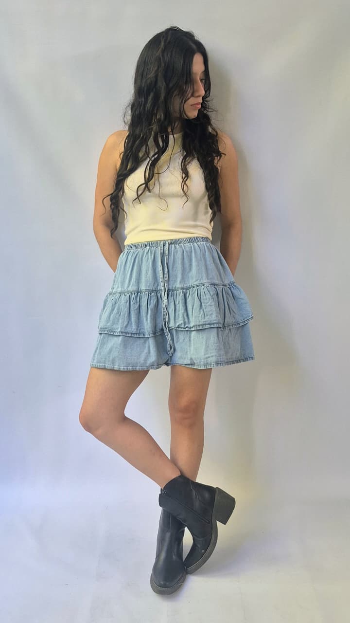 Pollera corta de denim camisero con volados, cintura elastizada y lazos atracados.