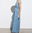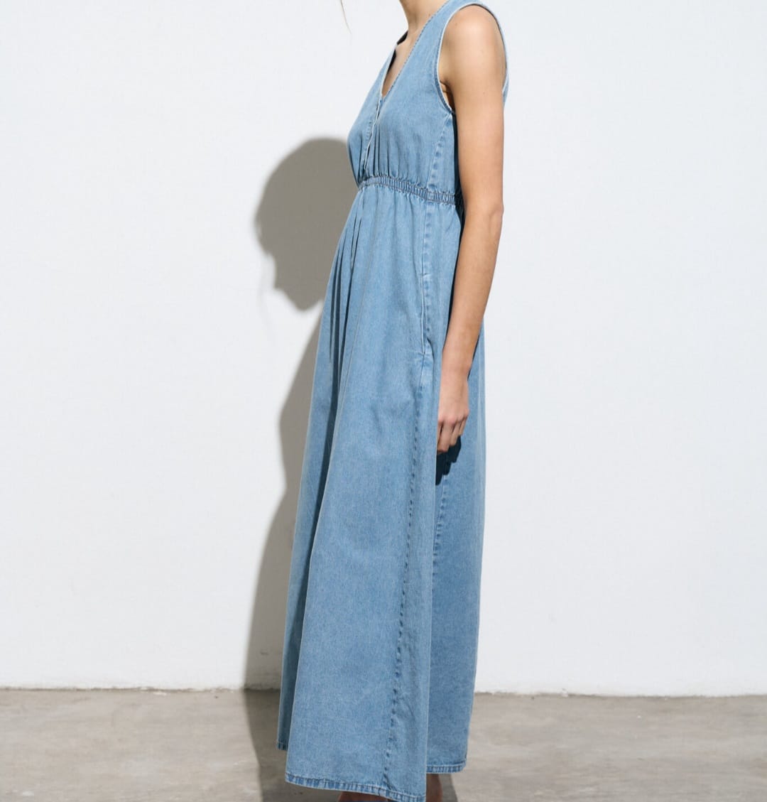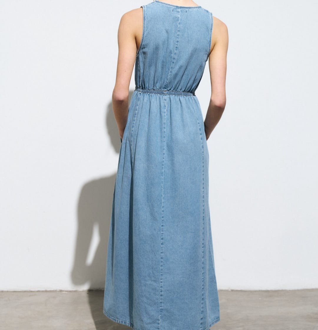 Maxi vestido de denim camisero con cartera en escote, elástico en la cintura y tajo en falda delantera.