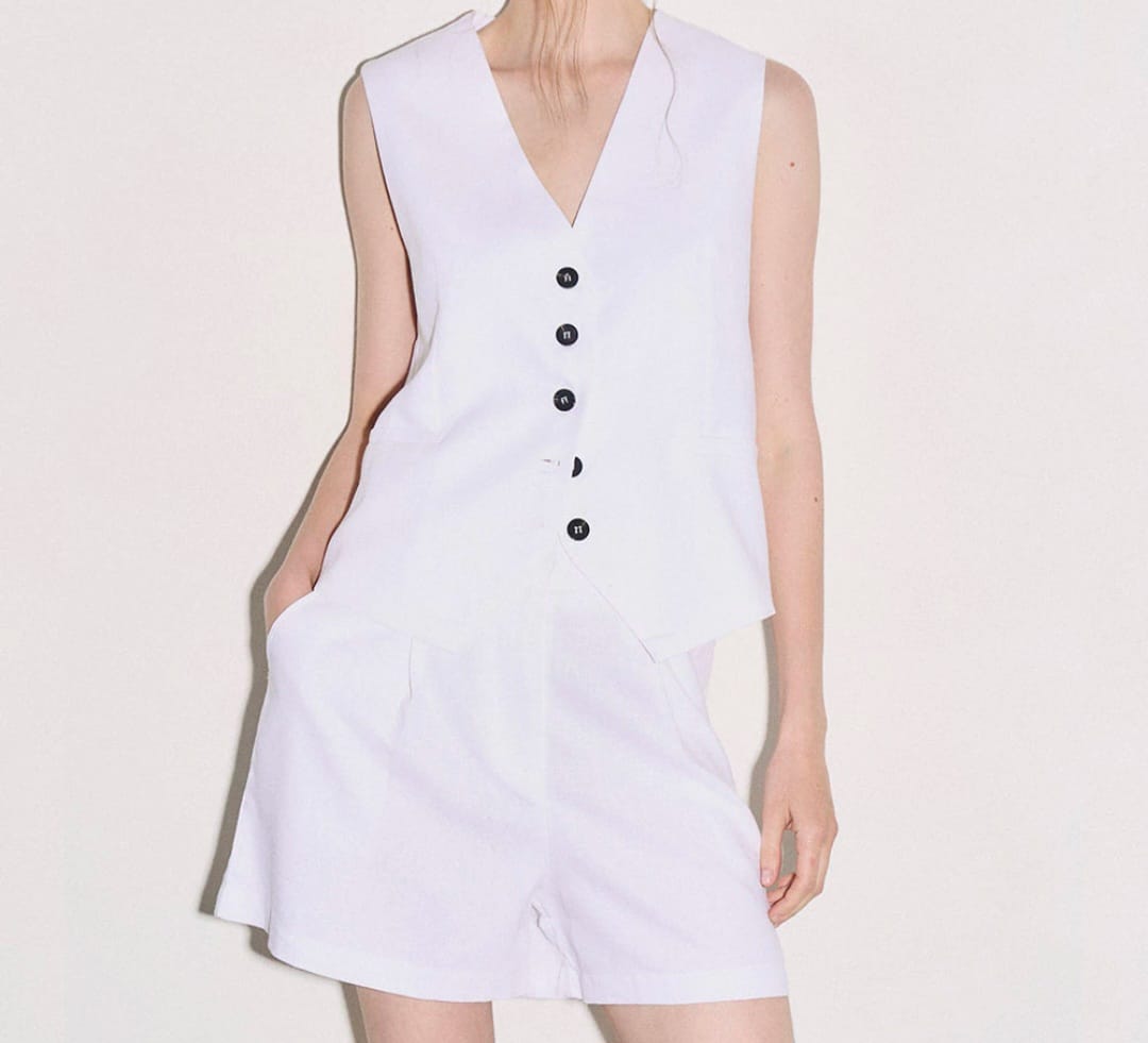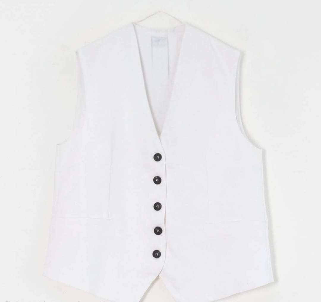 Chaleco oversized confeccionado con lino. Pinzas y bolsillos no funcionales en el delantero. Combinalo con el short Gap