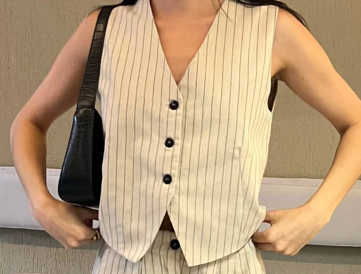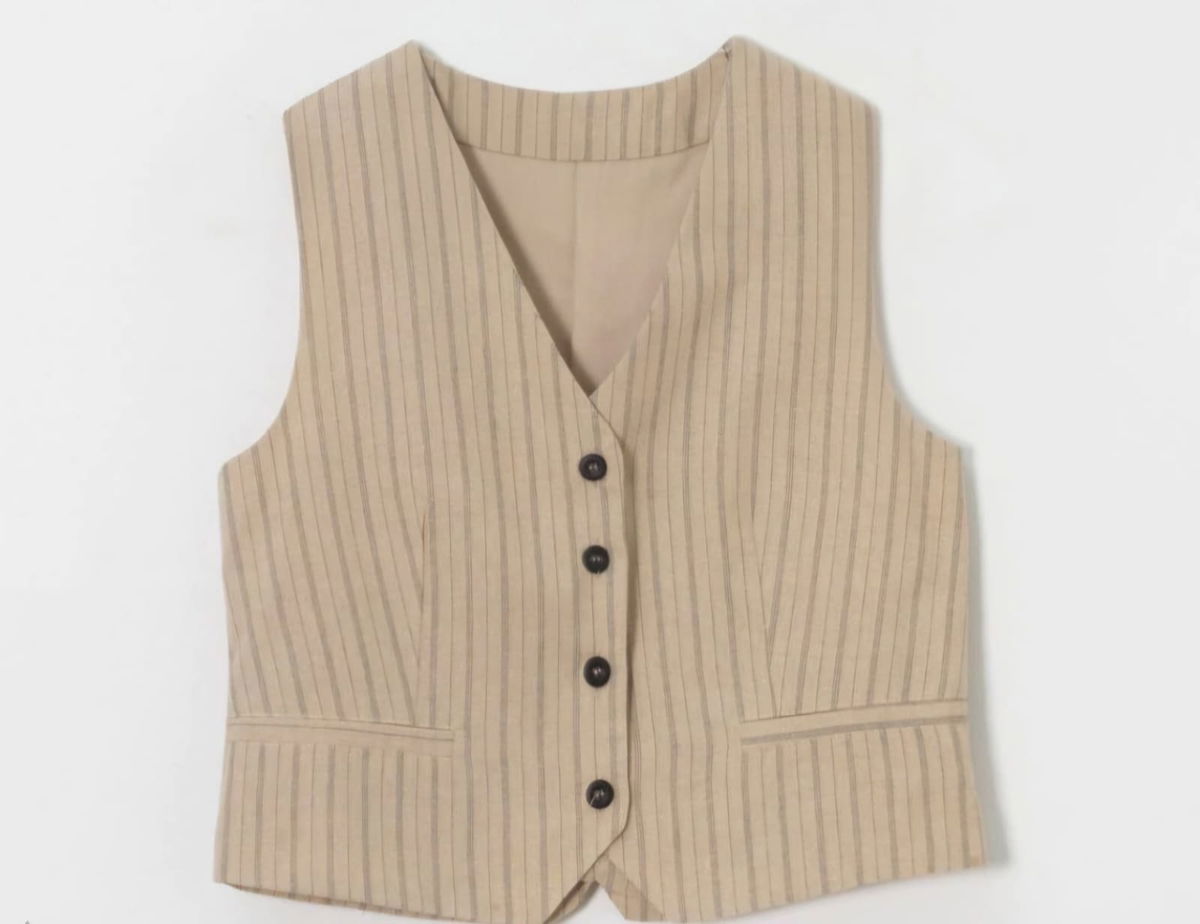 Chaleco con pinzas y bolsillos no funcionales en el delantero. Tiene forrería en su interno.