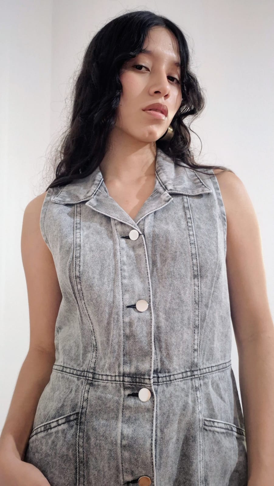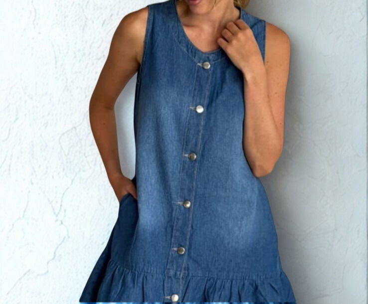 Vestido de mezclilla sin mangas, de corte entallado y con botones en la parte frontal.