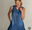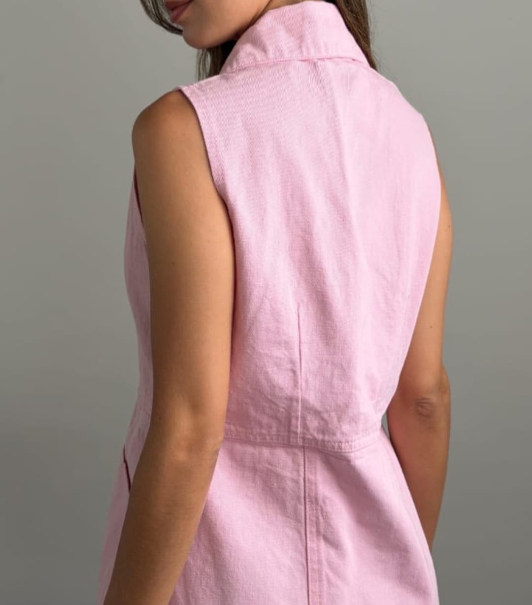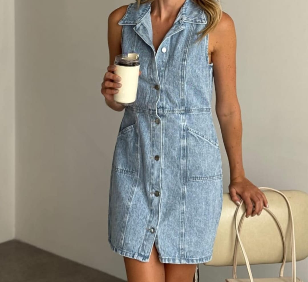 Vestido de mezclilla sin mangas, de corte entallado y con botones en la parte frontal.