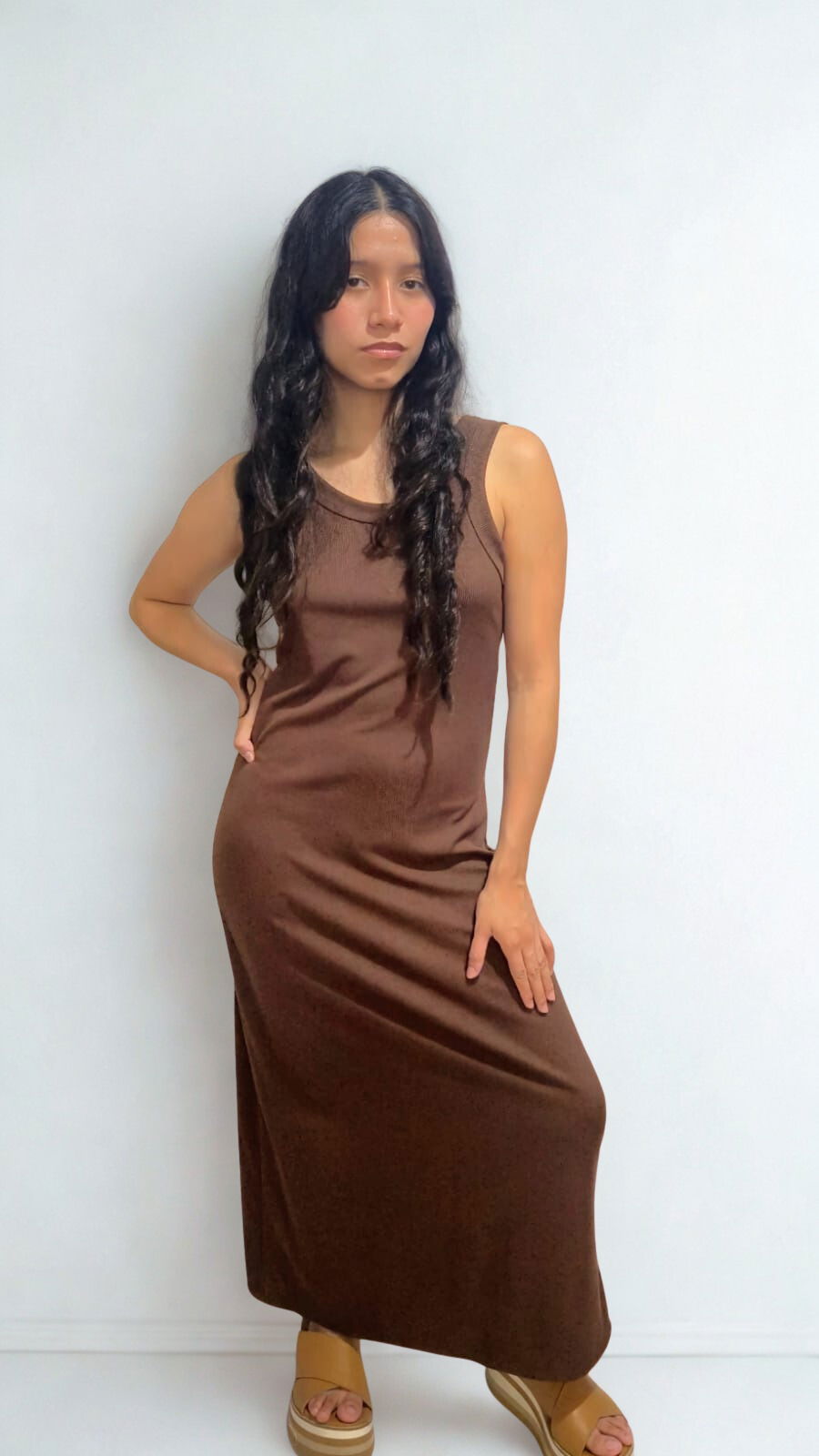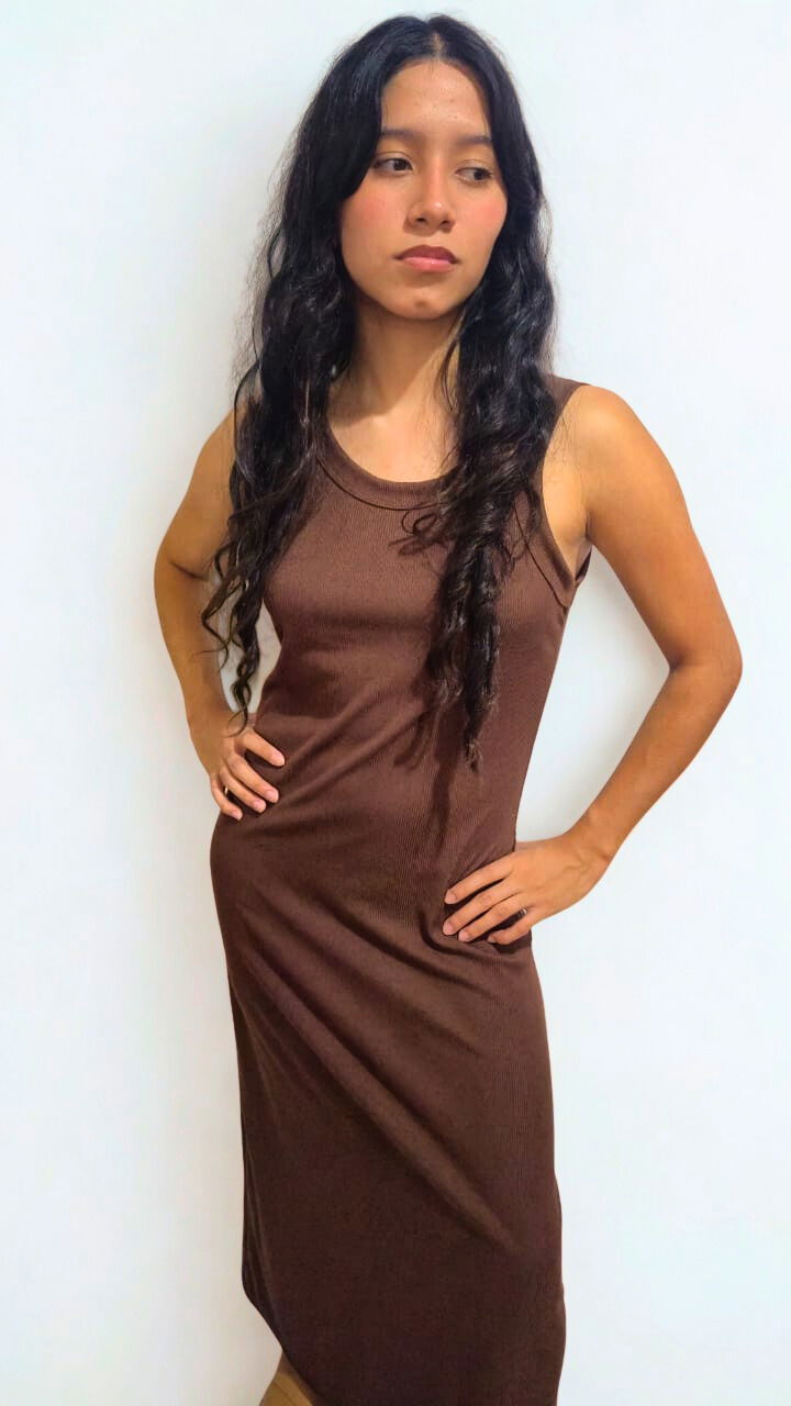 Vestido largo punto morley ceñido al cuerpo, presenta un escote redondo y con una textura anacalada.