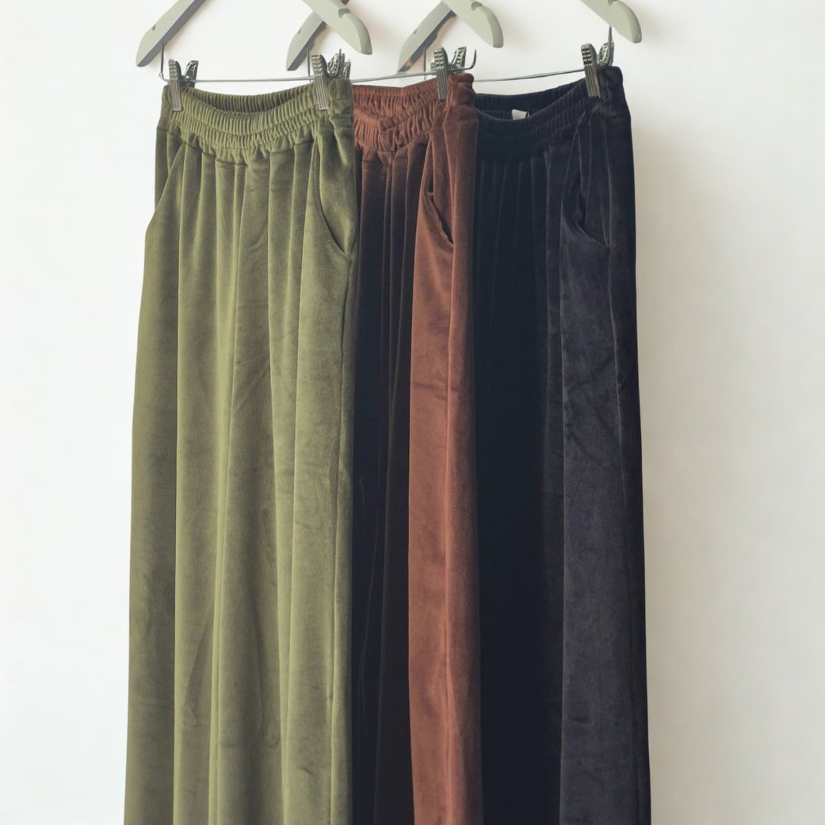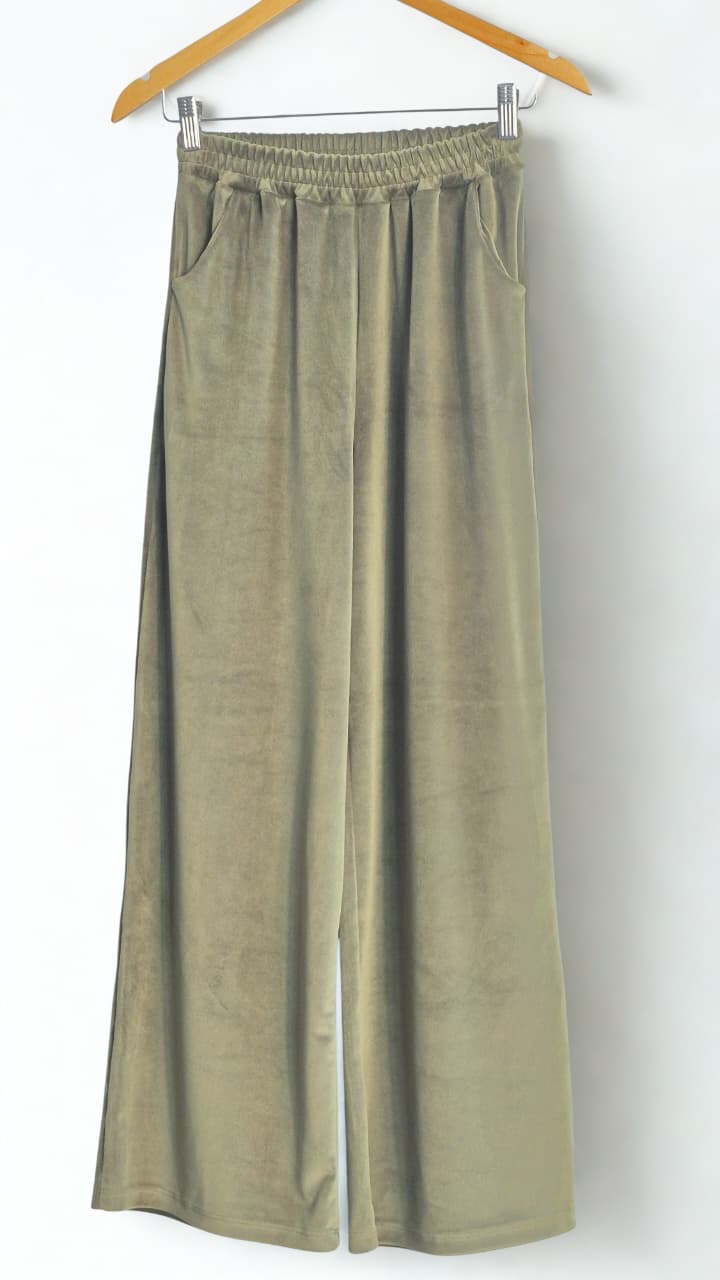 Pantal贸n palazzo plush caracterizado por su corte ancho, cintura elastizada y bolsillos laterales.