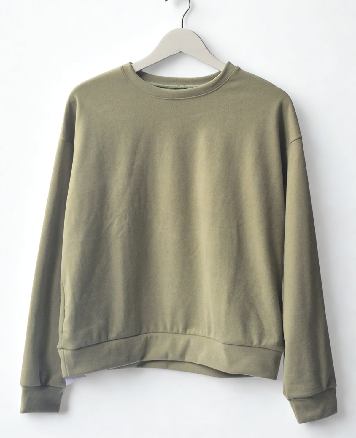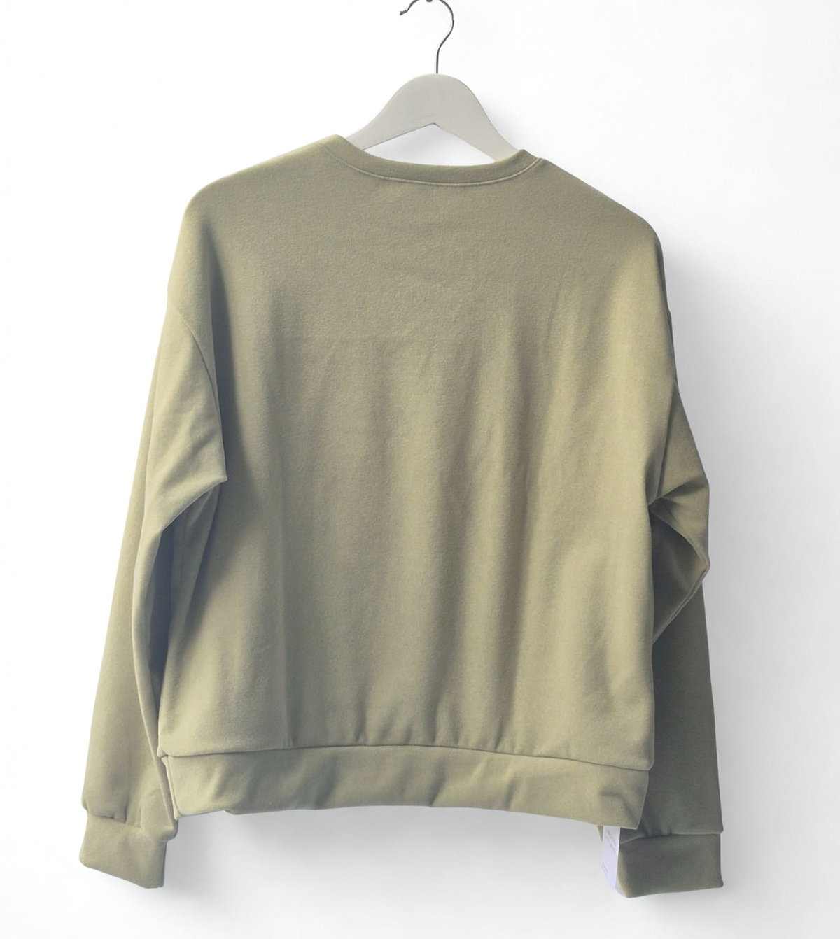 Buzo de cuello redondo en tono verde oliva, tiene un estilo oversized de hombros caídos, lo que le da una aparencia relajada y moderna. El largo llega a la altura de la cintura