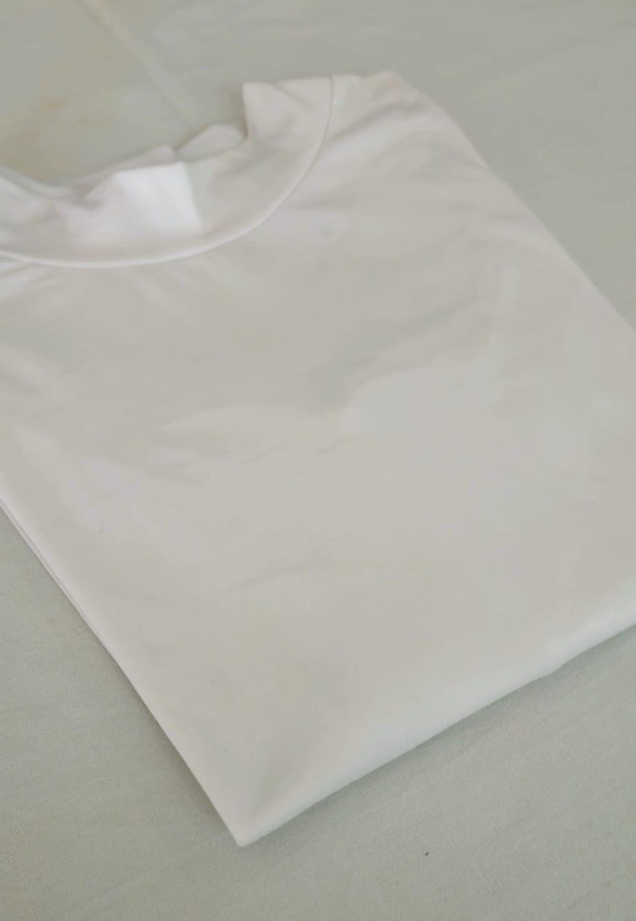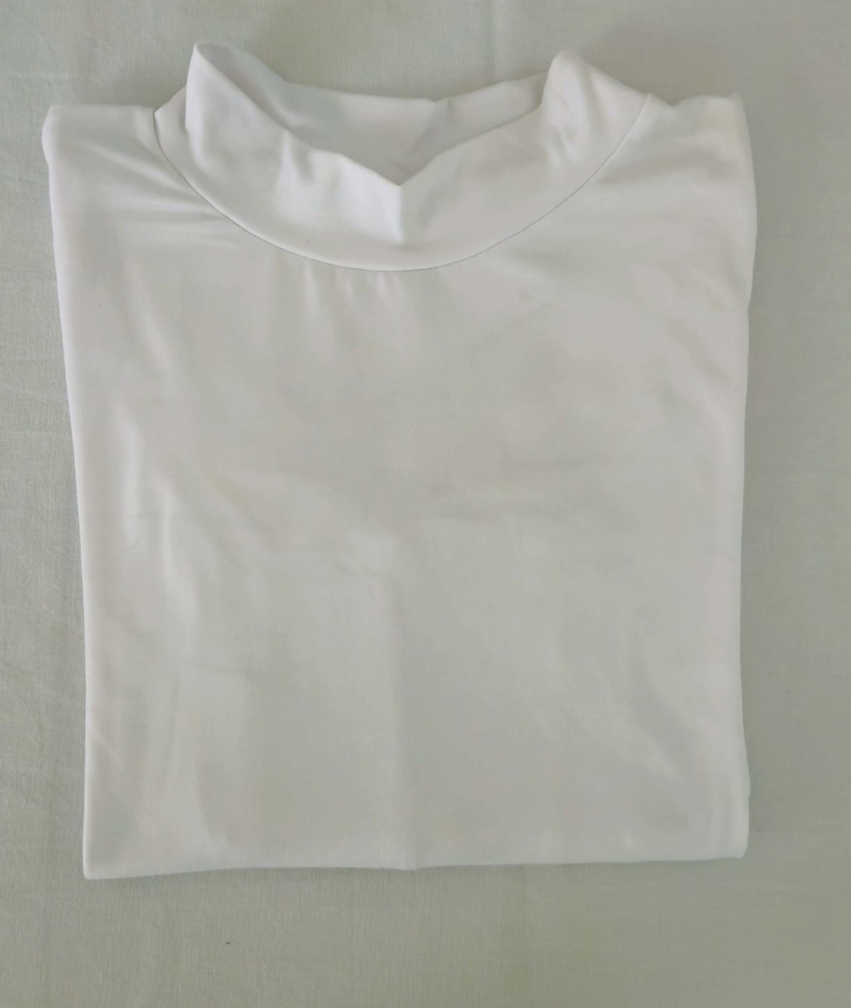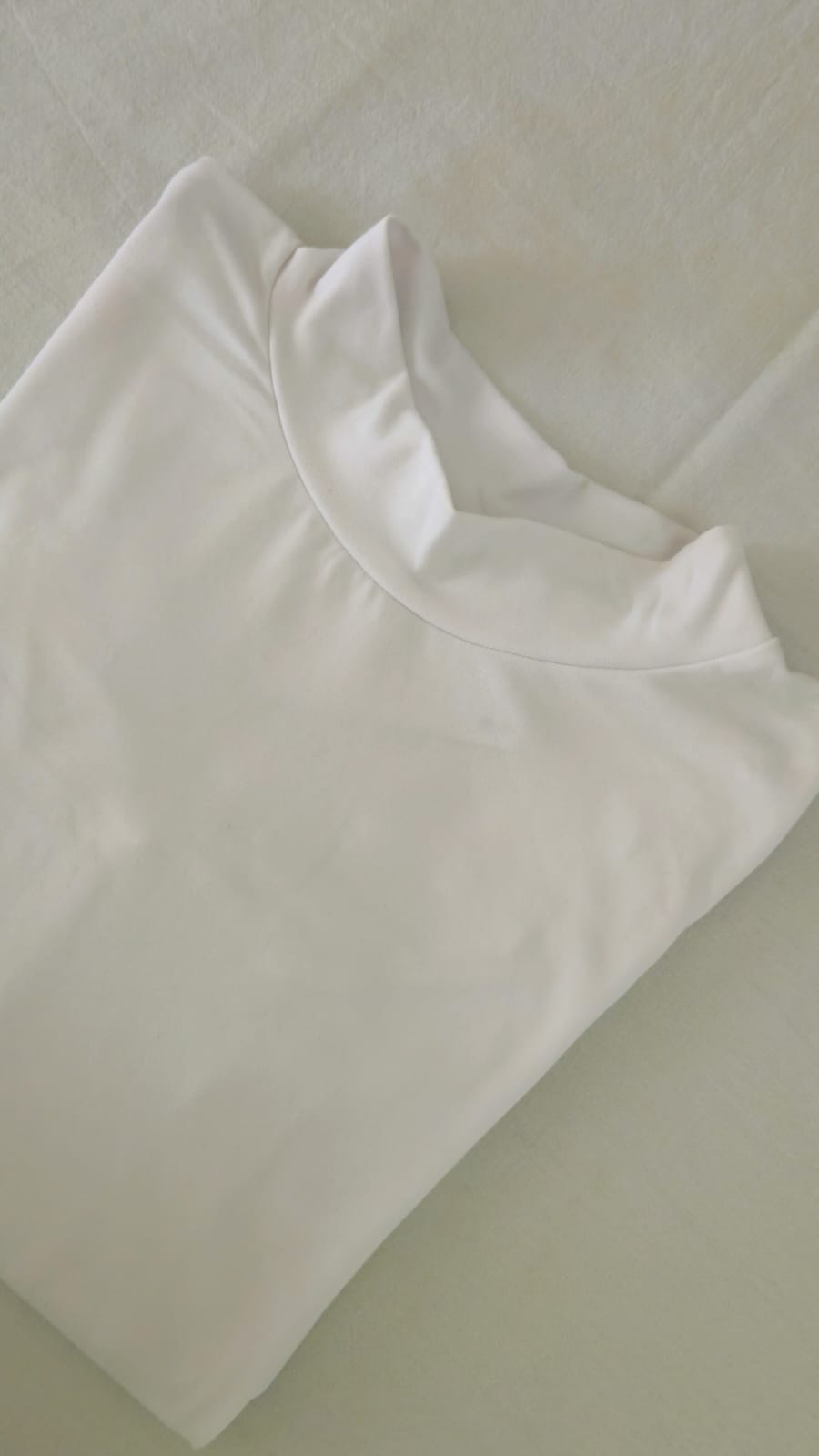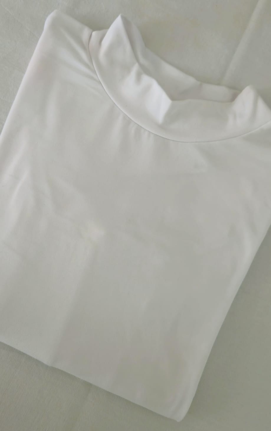 Media polera en color blanca de corte clásico, cubre la mitad del cuello, esta confeccionada en una mezcla de algodón con lycra, lo que le otorga elasticidad y un ajuste suave al cuerpo.