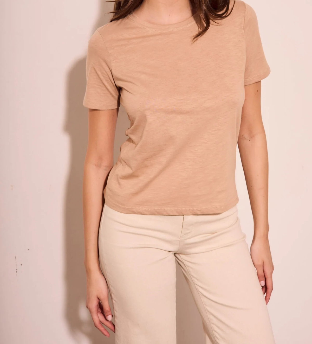 La modelo está usando talle S color Beige
